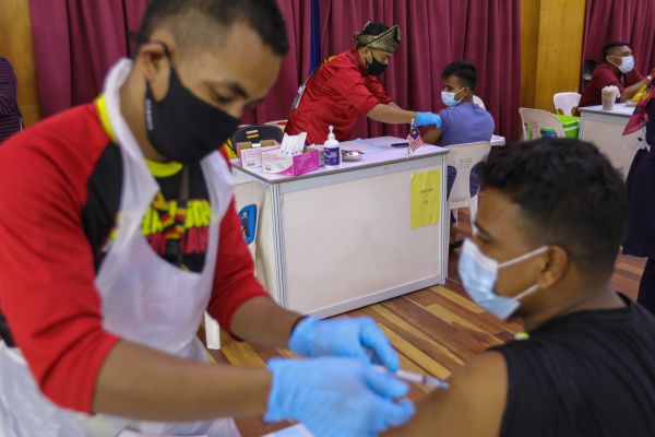 Petugas kesihatan selvax, Khairil Shahazuan Mohamed Hasnin, 32, (tengah) Lengkap berpakaian tradisional Malaysia sempena Hari Kebangsaan yang ke - 64 memberi suntikan pelalian Covid - 19 kepada penerima dos kedua vaksin di Pusat Pemberian Vaksin (PPV) Kompleks Sukan PKNS, Kelana Jaya pada 31 Ogos 2021. Foto HAFIZ OTHMAN/SELANGORKINI