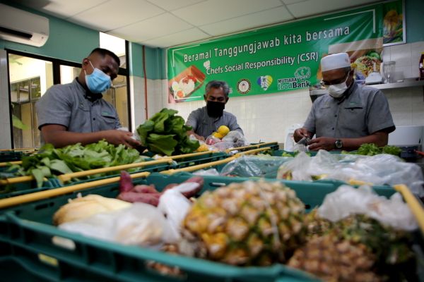 Kakitangan Mutiara Foodbank Pulau Pinang membungkus buah dan sayuran untuk diagihkan kepada orang ramai di Kompleks Masyarakat Penyayang pada 31 Ogos 2021. Foto AHMAD ZAKKI JILAN/SELANGORKINI