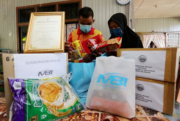 Bekas atlet olahraga paralimpik kebangsaan, Mohd Raduan Emeari dan ibunya, Normah Hassan melihat barangan keperluan harian yang diterimanya dalam program lawatan dan sumbangan CSR MBI di Kampung Bukit Belimbing, Kuala Selangor pada 10 September 2021. Foto AHMAD ZAKKI JILAN/SELANGORKINI