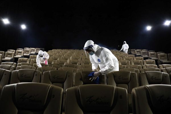 Kakitangan pawagam melakukan kerja nyahkuman di dalam panggung sebelum dibuka sepenuhnya kepada orang ramai selepas kerajaan membenarkan aktiviti itu kepada individu lengkap dos vaksin di Tanjung Golden Village (TGV) Cinema Central i-City, Shah Alam pada 14 September 2021. Foto REMY ARIFIN/SELANGORKINI