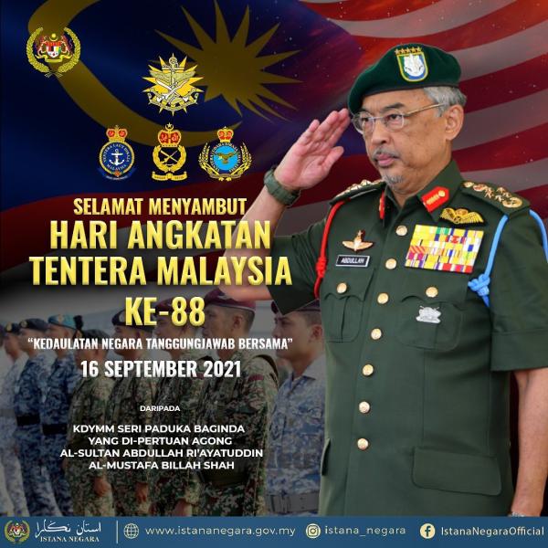 KUALA LUMPUR, 16 SEPT: Yang di-Pertuan Agong Al-Sultan Abdullah Ri'ayatuddin Al- Mustafa Billah Shah hari ini menzahirkan ucapan selamat menyambut Hari Angkatan Tentera Malaysia (ATM) ke-88 kepada seluruh warga angkatan tentera termasuk veteran serta semua yang pernah berkhidmat dengan ATM.
