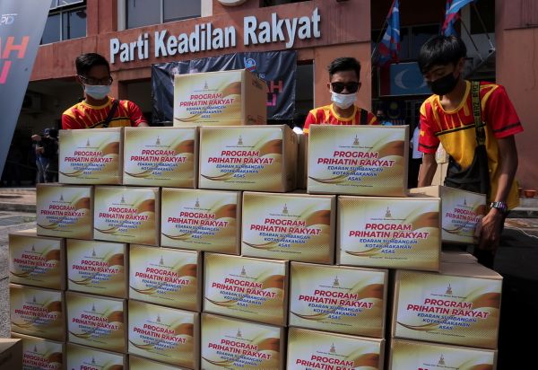 Tiga pemuda dari Anak Muda Ulu Klang (Amuk) menyusun kotak makanan asas dalam majlis pelepasan Jelajah Peduli Nadi Rakyat di Ibu Pejabat Parti KEADILAN, Petaling Jaya pada 17 September 2021. Foto AHMAD ZAKKI JILAN/SELANGORKINI