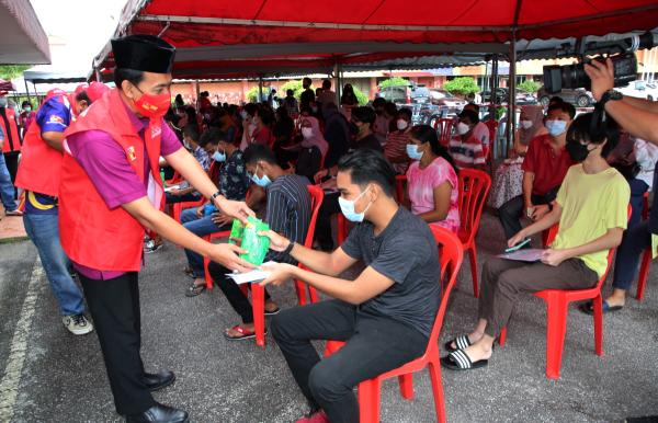 KLANG, 30 SEPT: Sebanyak 1,000 pek sarapan diedar Sukarelawan Kesihatan Komuniti Selangor (Suka) kepada remaja yang menerima vaksin di Sekolah Agama Menengah Tinggi Hisamuddin di sini, pagi tadi.