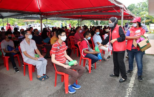 Sukarelawan Kesihatan Komuniti Selangor (Suka) Norfazlin Razali, 26, (dua dari kanan) dan S. Kaliamah, 48, mengedarkan pek sarapan pagi kepada pelajar dan ibu bapa di Sekolah Agama Menengah Tinggi Sultan Hisamuddin, Klang pada 30 September 2021. Foto AHMAD ZAKKI JILAN/SELANGORKINI