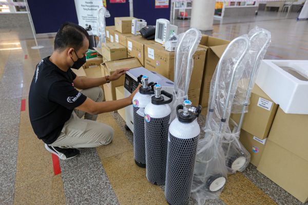 Eksekutif Pembagunan Perniagaan Selcare Farmasi, Syazwan Affandi Zulkipli membuat pemeriksaan ke atas alatan perubatan sebelum diserahkan kepada pihak hospital selepas majlis serahan di Hospital Ampang, Hulu Langat pada 3 September 2021. Foto HAFIZ OTHMAN/SELANGORKINI