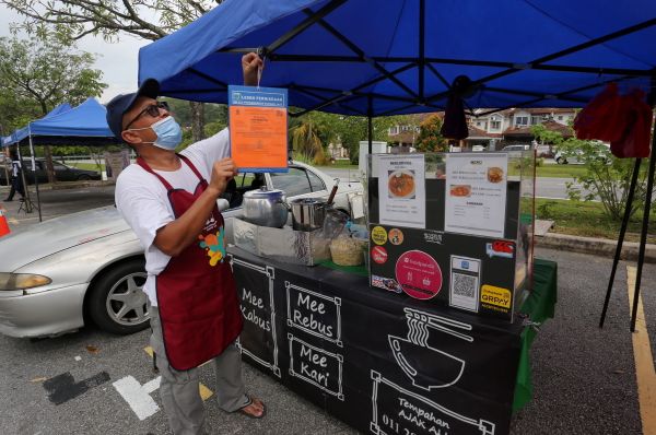 Abdul Razak Mohamad Razali menggantung lesen sementara yang diserahkan kepadanya oleh EXCO Kerajaan Tempatan, Pengangkutan Awan dan Pembangunan Kampung Baru, Ng Sze Han dalam Program Pemberian Permit Penjaja Sementara Pasca Covid-19 di Pusat Perniagaan Taman Puncak Jalil, Subang Jaya pada 7 September 2021. Foto AHMAD ZAKKI JILAN/SELANGORKINI