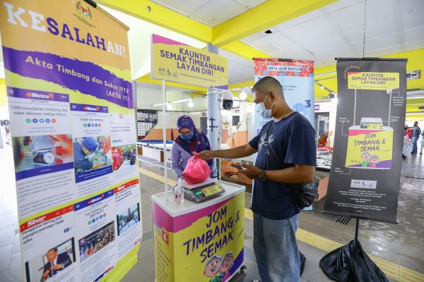 Seorang pengunjung menimbang barang yang dibeli di kuanter semak timbangan layan diri di Pasar Basah Pasir Penambang, Kuala Selangor pada 5 Oktober 2021. Foto FIKRI YUSOF/SELANGORKINI