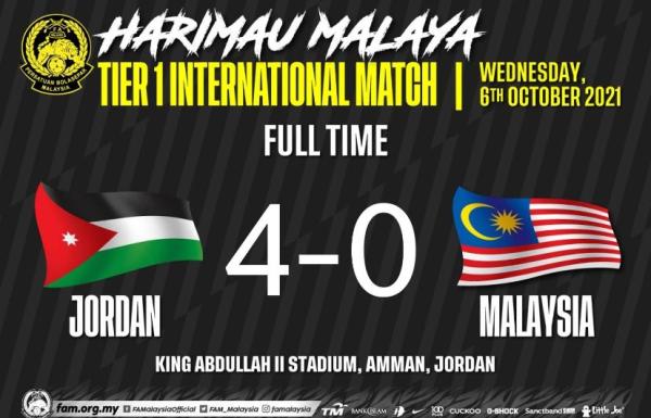 KUALA LUMPUR, 7 OKT: Tindakan gopoh barisan pertahanan skuad bola sepak kebangsaan mengundang padah apabila tewas 4-0 kepada Jordan dalam aksi persahabatan antarabangsa Tier 1 di Amman, Jordan malam tadi.