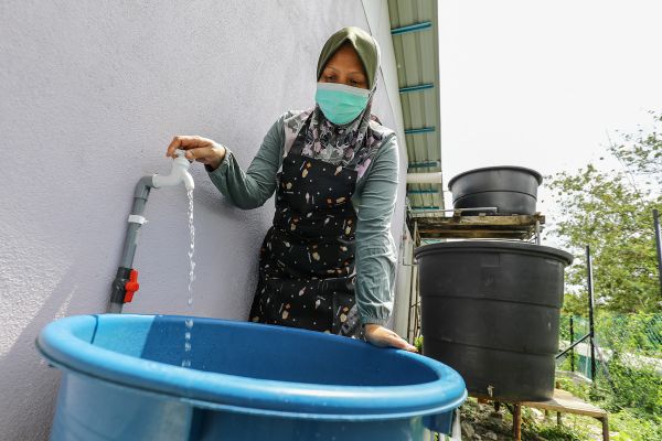 Pemilik Warung Mak Dara Corner, Yuslina Mohd Yusof mengisi air ke dalam tong sebagai persediaan berikutan naik taraf Loji Rawatan Air Sungai Selangor Fasa 1 ketika tinjauan di Jalan Kebun, Shah Alam pada 6 Oktober 2021. Foto FIKRI YUSOF/SELANGORKINI
