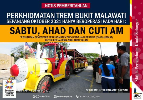 SHAH ALAM, 11 OKT: Perkhidmatan trem Bukit Malawati, Kuala Selangor dekat sini hanya beroperasi pada Sabtu, Ahad dan cuti am sepanjang bulan ini.