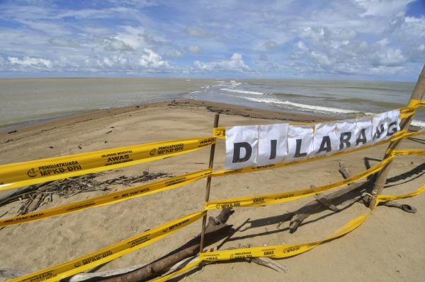 KOTA BHARU, 20 OKT: Kawasan fenomena air surut sehingga menampakkan beting pasir dan membuatkan laut kelihatan seolah-olah terbelah di Pantai Mek Mas, Kuala Besar, di sini ditutup kepada orang ramai sejak Isnin lepas.