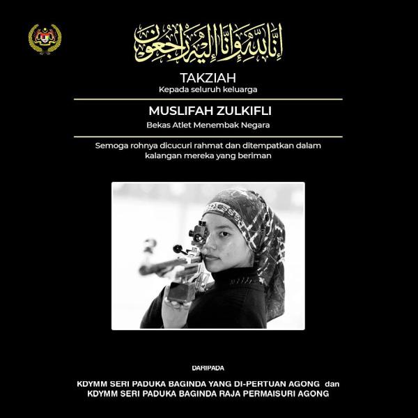 KUALA LUMPUR, 6 NOV: Yang di-Pertuan Agong Al-Sultan Abdullah Ri'ayatuddin Al-Mustafa Billah Shah dan Raja Permaisuri Agong Tunku Hajah Azizah Aminah Maimunah Iskandariah menzahirkan ucapan takziah kepada keluarga bekas atlet menembak negara Muslifah Zulkifli yang meninggal dunia hari ini.