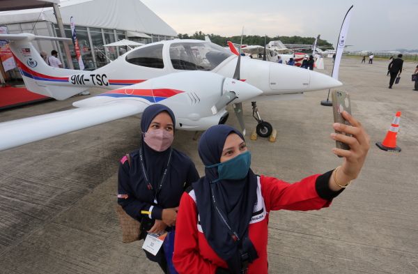 Pensyarah Universiti Teknologi Mara (UiTM) Shah Alam Nor Roslina Rosli (kanan) berswafoto bersama rakannya Wan Romaria Wan Ahmad ketika mengunjungi Pameran Udara Selangor (SAS) 2021 di Pusat Penerbangan Serantau Skypark, Subang pada 25 November 2021.