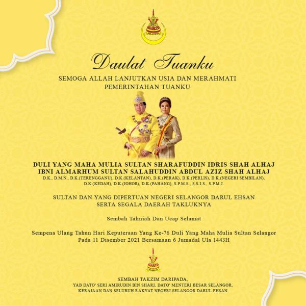 SHAH ALAM, 11 DIS: Dato' Menteri Besar yang mewakili kepimpinan negeri dan rakyat jelata menjunjung kasih tahniah buat Duli Yang Maha Mulia (DYMM) Sultan Sharafuddin Idris Shah Alhaj sempena Hari Keputeraan Baginda ke-76 hari ini.