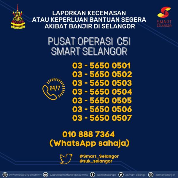 SHAH ALAM, 19 DIS: Penduduk negeri ini yang berada dalam kecemasan akibat banjir boleh menghubungi Pusat Operasi C5i Smart Selangor (SSOC) untuk sebarang bantuan.