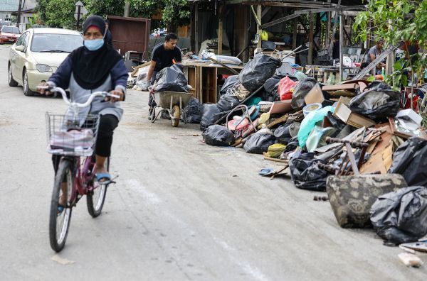 Penduduk melonggokkan sampah dan perkakasan rumah yang rosak akibat banjir di hadapan rumah mereka sebelum diuruskan pelupusannya oleh pihak berwajib semasa melakukan kerja pembersihan kediaman masing-masing selepas banjir surut di Kampung Kenangan, Puchong pada 23 Disember 2021. Foto FIKRI YUSOF/SELANGORKINI