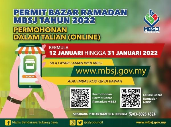 SHAH ALAM, 12 JAN: Majlis Bandaraya Subang Jaya (MBSJ) membuka permohonan permit bazar Ramadan bermula hari ini sehingga 31 Januari 2022.