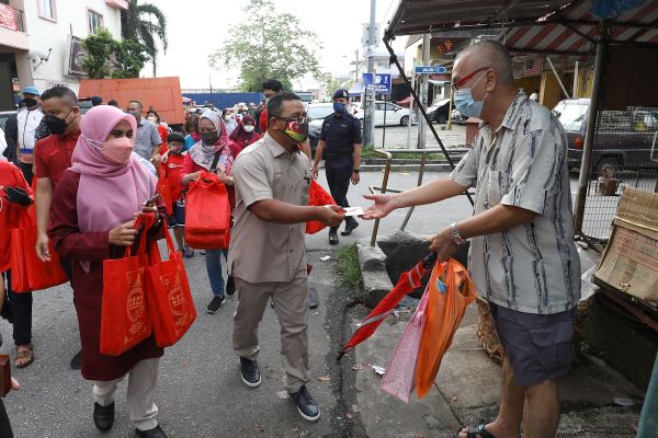 Dato' Menteri Besar, Dato' Seri Amirudin Shari dan isteri, Datin Seri Masdiana Muhammad menyerahkan angpau serta buah limau sempena Tahun Baharu Cina di sekitar Pasar Selayang Baru, Gombak pada 23 Januari 2022. Foto REMY ARIFIN/SELANGORKINI