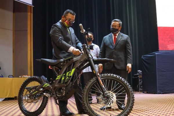 Dato' Menteri Besar, Dato' Seri Amirudin Shari (tengah) menyumbangkan basikal elektirk kepada Unit Pengurusan Bencana Negeri Selangor bagi tujuan operasi pemantauan turut bersama Setiausaha Kerajaan Selangor Datuk Haris Kasim (kanan) pada Majlis Amanat Tahun Baharu di Dewan Jubli Perak Bangunan Sultan Salahuddin Abdul Aziz pada 24 Januari 2022. Foto REMY ARIFIN/SELANGORKINI