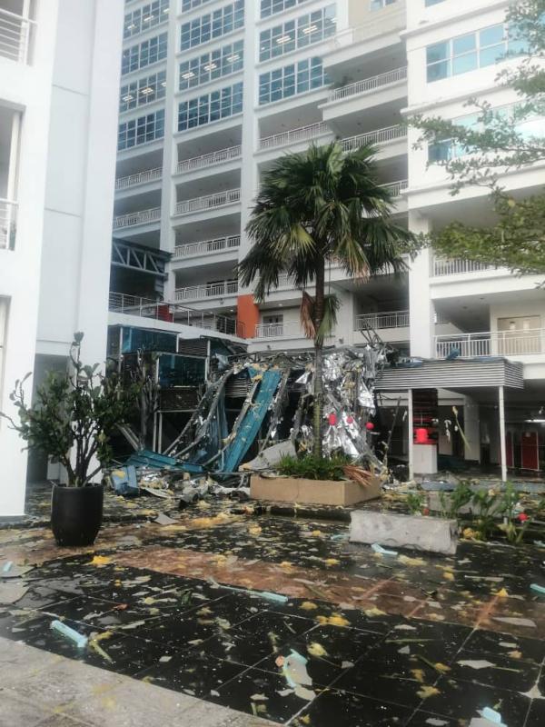 SHAH ALAM, 27 JAN: Bumbung bahagian lobi Kompleks Management and Science University (MSU), Seksyen 13 dekat sini runtuh akibat hujan dan angin kencang petang tadi.