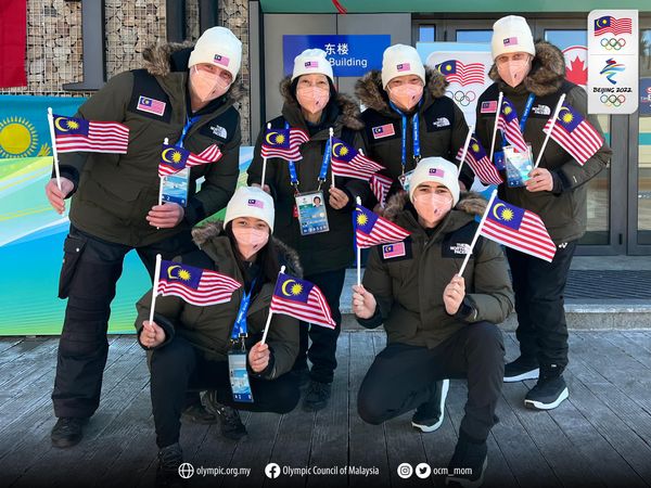 KUALA LUMPUR, 5 FEB: Dua peluncur ski negara, Jeffrey Webb dan Aruwin Salehhuddin mengarak Jalur Gemilang masuk ke Stadium Nasional Beijing pada upacara perasmian Sukan Olimpik Musim Sejuk Beijing 2022 malam tadi sebagai tanda penyertaan Malaysia sebuah negara beriklim Khatulistiwa dalam temasya sukan berprestij itu.