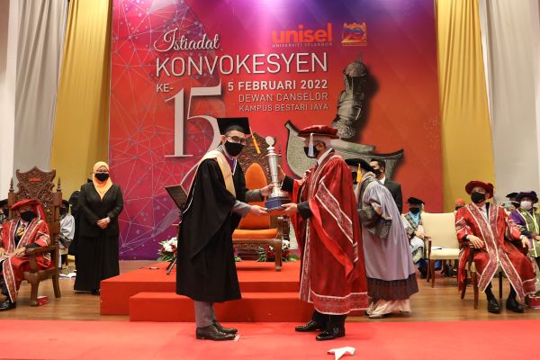 Canselor Unisel, Tan Sri Raja Arshad Tun Uda (tengah) menyampaikan piala Anugerah Canselor 2020 kepada graduan Fakulti Perniagaan dan Perakaunan, Muhammad Farid Wahid (kiri) sempena Istiadat Konvokesyen Unisel ke-15 di Dewan Canselor Unisel, Bestari Jaya, Kuala Selangor pada 5 Februari 2022. Foto REMY ARIFIN/SELANGORKINI