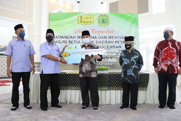 Pengarah Jabatan Kerja Raya Selangor (JKR) Ir Lokman Nasir (dua,kiri) menyerahkan replika kunci kepada Pengarah Jabatan Agama Islam Selangor (Jais) Dato' Mohd Shahzihan Ahmad (tiga,kanan) sebagai gimik pelancaran Masjid Setia Alam di Seksyen U13, Shah Alam pada 10 Februari 2022. Foto REMY ARIFIN/SELANGORKINI