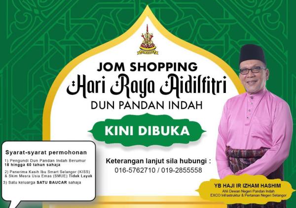 SHAH ALAM, 19 MAC: Warga Dewan Undangan Negeri (DUN) Pandan Indah dipelawa memohon baucar beli-belah RM100 secara dalam talian sempena sambutan Hari Raya Aidilfitri.