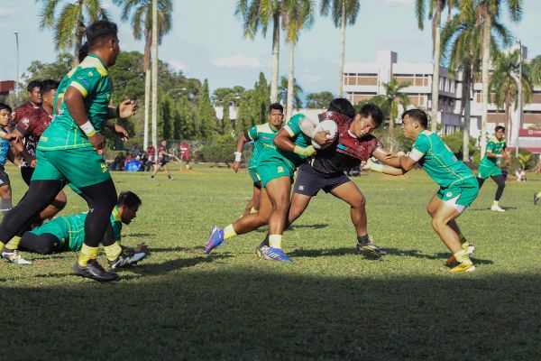 Pasukan Serdang Angels mengasak lawan dari pasukan Koba Rc ketika perlawanan akhir Liga Ragbi Majlis Sukan Negeri (MSN) Selangor-Kesatuan Ragbi Selangor (KRS) di Padang Ragbi A, Universiti Putra Malaysia (UPM), Serdang pada 19 Mac 2022. Foto REMY ARIFIN/SELANGORKINI