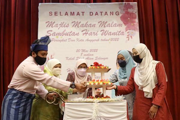 ADN Kota Anggerik, Najwan Halimi (kiri) dan ADN Batu Rodziah Ismail (tengah) serta ADN Bukit Melawati, Juwairiya Zulkifli (kanan) memotong pulut kuning sempena majlis Makan Malam sambutan Hari Wanita peringkat Dun Kota Anggerik di Seksyen 13, Kelab Shah Alam pada 20 Mac 2022. Foto REMY ARIFIN/SELANGORKINI