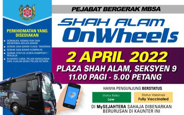 SHAH ALAM, 31 MAC: Majlis Bandaraya Shah Alam (MBSA) akan mengadakan pejabat bergerak 'Shah Alam On Wheels' di Plaza Masalam Seksyen 9 di sini, pada Sabtu ini.