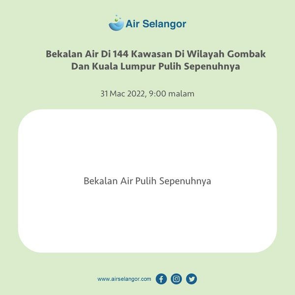 Pengguna boleh merujuk kesemua saluran komunikasi rasmi seperti aplikasi Air Selangor, Facebook, Instagram dan Twitter atau hubungi Air Selangor di talian 15300.