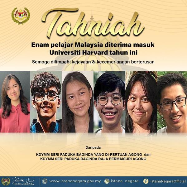 KUALA LUMPUR, 6 APRIL: Yang di-Pertuan Agong Al-Sultan Abdullah Ri'ayatuddin Al-Mustafa Billah Shah dan Raja Permaisuri Agong Tunku Hajah Azizah Aminah Maimunah Iskandariah hari ini menzahirkan ucapan tahniah kepada enam pelajar Malaysia yang berjaya melanjutkan pelajaran ke Universiti Harvard.
