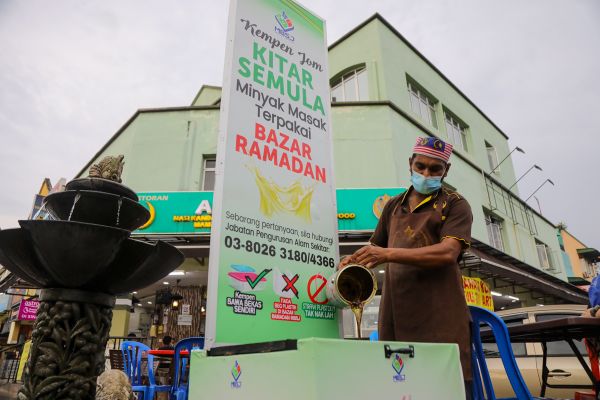 Pekerja restoran menuangkan minyak terpakai di dalam tong kitar semula minyak masak terpakai ketika Program Berbuka Puasa bersama Penjaja Bazar Ramadan Puncak Jalil, Subang Jaya pada 13 April 2022. Foto HAFIZ OTHMAN/SELANGORKINI