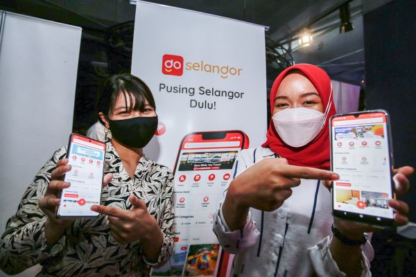 Kakitangan Tourism Selangor Sdn Bhd Fatin Nur Ain Hazreem Harul, 20,(kanan) bersama Tunku Farah Emyra Tunku Mohammad Shaharil,23, menunjukkan Aplikasi Go Selangor pada pelancarannya di i-CITY,Shah Alam pada 14 April 2022. Foto FIKRI YUSOF/SELANGORKINI