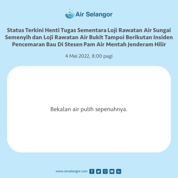 SHAH ALAM, 4 MEI: Bekalan air di 472 kawasan dalam lima wilayah pulih sepenuhnya 8 pagi ini setelah mengalami gangguan tidak berjadual akibat henti tugas sementara dua loji rawatan (LRA).