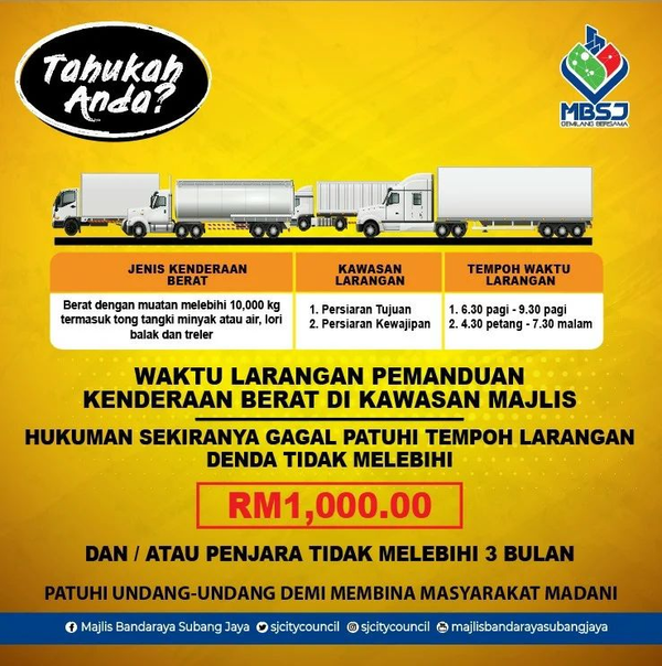 SHAH ALAM, 9 MEI: Denda RM1,000 dikenakan terhadap pemandu kenderaan berat yang memandu dalam tempoh masa larangan di kawasan Majlis Bandaraya Subang Jaya (MBSJ).