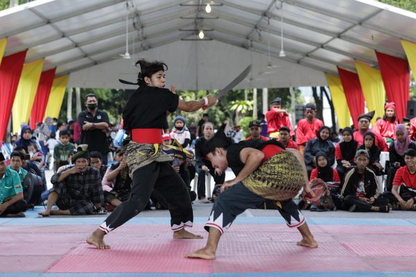 Peserta dari Persatuan Seni Silat Bangau Putih Selangor mempersembahkan aksi mereka pada Kejohanan Seni Bela Diri Selangor Xtiv di Dataran Kemerdekaan Shah Alam pada 29 Mei 2022. Foto FIKRI YUSOF/SELANGORKINI