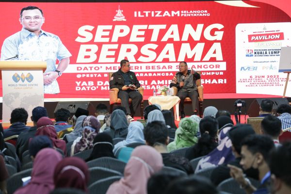 Dato' Menteri Besar Dato'Seri Amirudin Shari disertai Pengarah Perbadanan Perpustakaan Awam Selangor Datin Paduka Mastura Muhamad (kanan) meninjau reruai buku ketika Pesta Buku Antarabangsa Kuala Lumpur di Pusat Dagangan Dunia Kuala Lumpur pada 6 Jun 2022. Foto FIKRI YUSOF/SELANGORKINI[/caption]