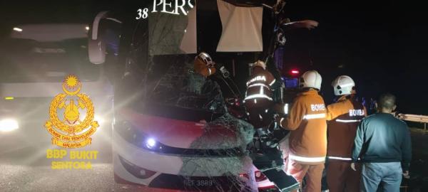 KUALA LUMPUR, 17 JUN: Seorang penumpang wanita maut manakala 39 lagi cedera ringan dalam kemalangan melibatkan sebuah bas persiaran dengan treler di kilometer 425.8 Lebuhraya Utara Selatan (PLUS) menghala ke selatan berhampiran Bukit Beruntung, Selangor.