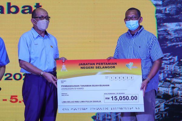 EXCO Infrastruktur dan Pertanian Ir Izham Hashim bergambar bersama penerima insentif pertanian ketika Jelajah Selangor Penyayang di padang Taman Kosas, Ampang pada 19 Jun 2022. Foto HAFIZ OTHMAN/SELANGORKINI[/caption]