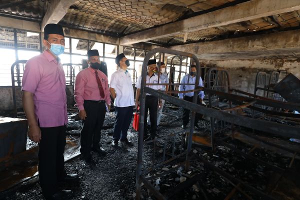 EXCO Hal Ehwal Agama Islam, Pengguna dan Industri Halal Mohd Zawawi Ahmad Mughni (kiri) meninjau keadaan asrama pelajar lelaki selepas majlis penyerahan sumbangan kewangan kepada 43 pelajar yang terlibat dalam kebakaran di Sekolah Agama Menengah Sultan Hisamuddin di Sungai Bertih, Klang pada 21 Jun 2022. Foto REMY ARIFIN/SELANGORKINI
