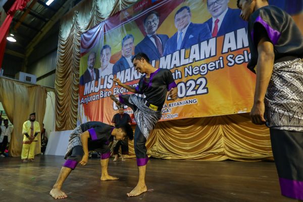 Persatuan Silat Gayong Klang membuat persembahan seni silat ketika Majlis Makan Malam Amal biro Ekonomi Amanah Negeri Selangor di Dewan Persatuan Bola Keranjang, Kuala Langat pada 3 Julai 2022. Foto HAFIZ OTHMAN/SELANGORKINI