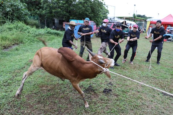 Petugas berusaha menumbangkan lembu korban untuk di sembelih sempena program Qurban Perdana di Padang Changi, Kampung Sungai Tua Baharu, Gombak pada 11 Julai 2022. Foto FIKRI YUSOF/SELANGORKINI
