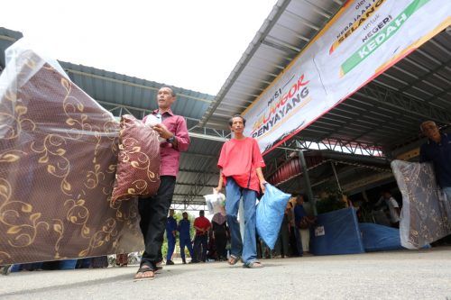Mangsa banjir mengambil barang keperluan yang disumbangkan oleh Kerajaan Negeri Selangor sempena Misi Selangor Penyayang 2.0 di Masjid Kampung Sadek, Baling, Kedah pada 21 Julai 2022. Foto AHMAD ZAKKI JILAN/SELANGORKINI