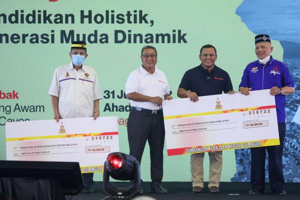 Sumbangan sebanyak RM50,000 itu diserahkan kepada wakil Persatuan Bekas Polis Malaysia Selangor iaitu Rosli Hashim manakala Persatuan Veteran Angkatan Tentera Malaysia Selangor kepada wakilnya Mohd Din Hosin.