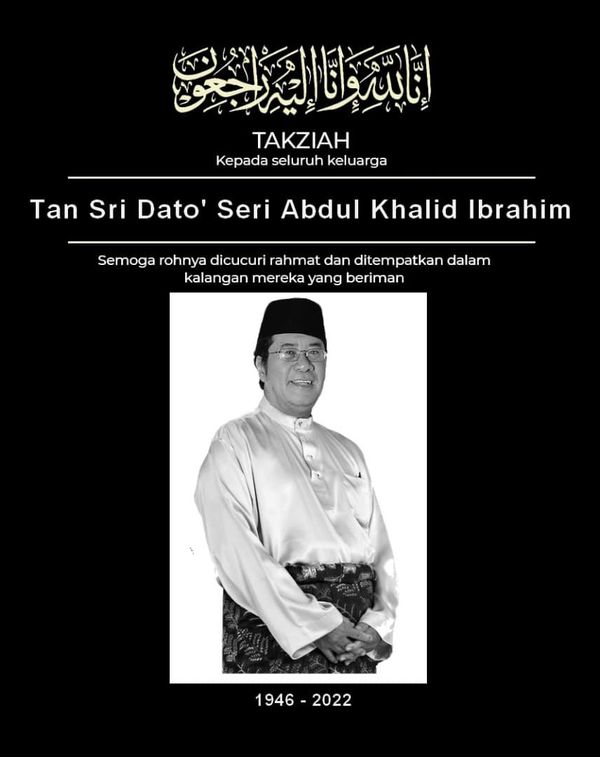 SHAH ALAM, 31 JULAI: Bekas Dato' Menteri Besar Selangor Tan Sri Abdul Khalid Ibrahim telah meninggal dunia pada 11.08 malam tadi di Hospital Cardiac Vascular Sentral, Kuala Lumpur.