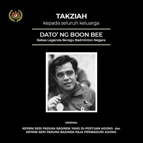 KUALA LUMPUR, 4 OGOS: Yang di-Pertuan Agong Al-Sultan Abdullah Ri'ayatuddin Al-Mustafa Billah Shah dan Raja Permaisuri Agong Tunku Hajah Azizah Aminah Maimunah Iskandariah menzahirkan ucapan takziah kepada keluarga legenda beregu badminton negara Datuk Ng Boon Bee yang meninggal dunia semalam.