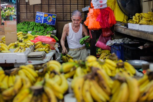 Seorang peniaga buah sedang meyusun buah pisang di kedainya ketika tinjauan Media Selangor di Pasar Sentul, Kuala Lumpur pada 5 Ogos 2022. Pisang mempunyai banyak manfaat untuk melancarkan proses pencernaan makanan dan pada masa sama membantu mendapatkan kecantikan secara semula jadi. Kaya dengan vitamin B, C, B6, magnesium, zat besi dan kalsium, pisang terbukti dapat membantu dalam proses merawat wajah secara semula jadi. Foto HAFIZ OTHMAN/SELANGORKINI