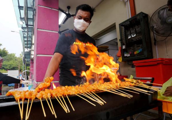 Pemilik Restoran Abam Satay Mohd Fazrin Izwan menunjukkan sate yang siap dibakar di restorannya di Setia Alam, Shah Alam pada 17 Jun 2022. Foto AHMAD ZAKKI JILAN/SELANGORKINI[/caption]
